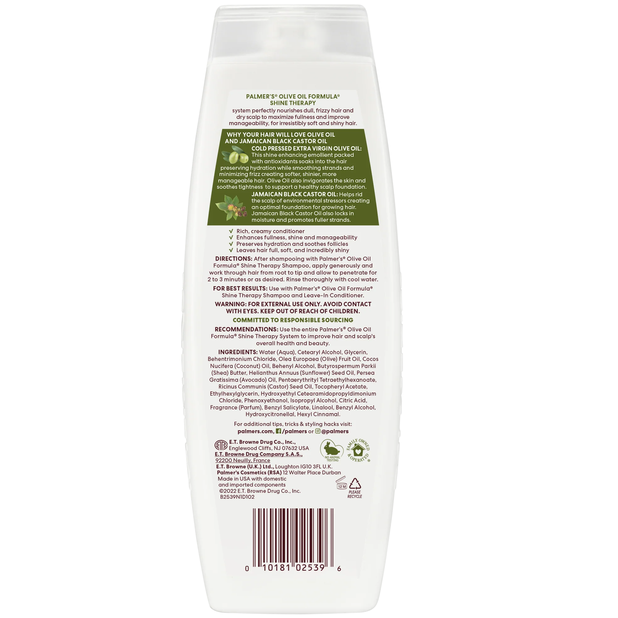 Palmer's Olive Oil Formula collection perfectly nourishes dull, frizzy hair and dry scalp to maximize fullness and improve manageability, for irresistibly soft and shiny hair. Palmer's Olive Oil Formula Shine Therapy perfectly nourishes dull, frizzy hair and dry scalp to maximize fullness and improve manageability, for irresistibly soft and shiny hair. This shine enhancing emollient packed with antioxidants soaks into the hair preserving hydration while smoothing strands and minimizing frizz creating softer, shinier more manageable hair. Olive Oil also invigorates the skin and soothes tightness to support a healthy scalp foundation. Helps rid the scalp of environmental toxins creating an optimal foundation for growing hair. Jamaican Black Castor Oil also locks in moisture and promotes fuller strands.