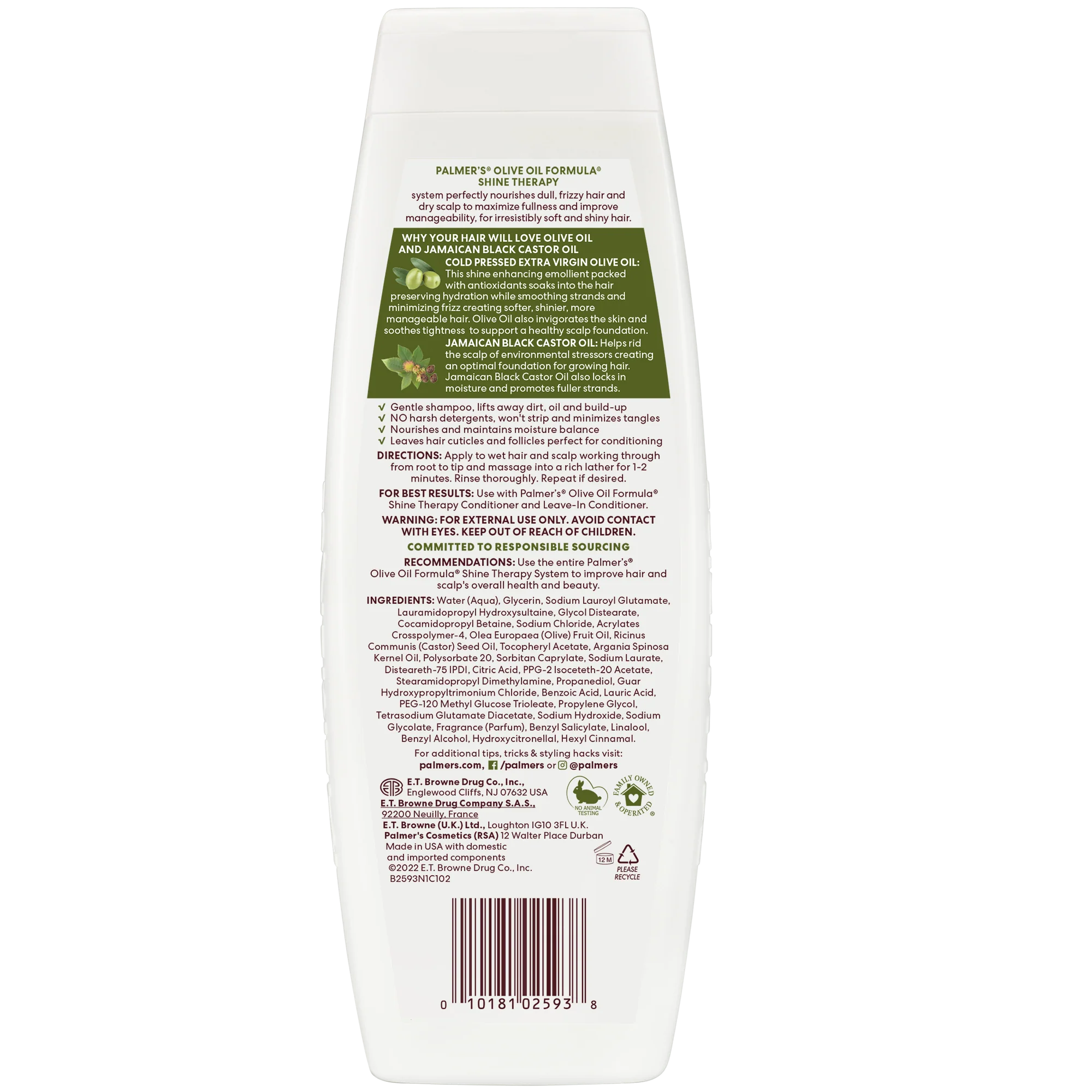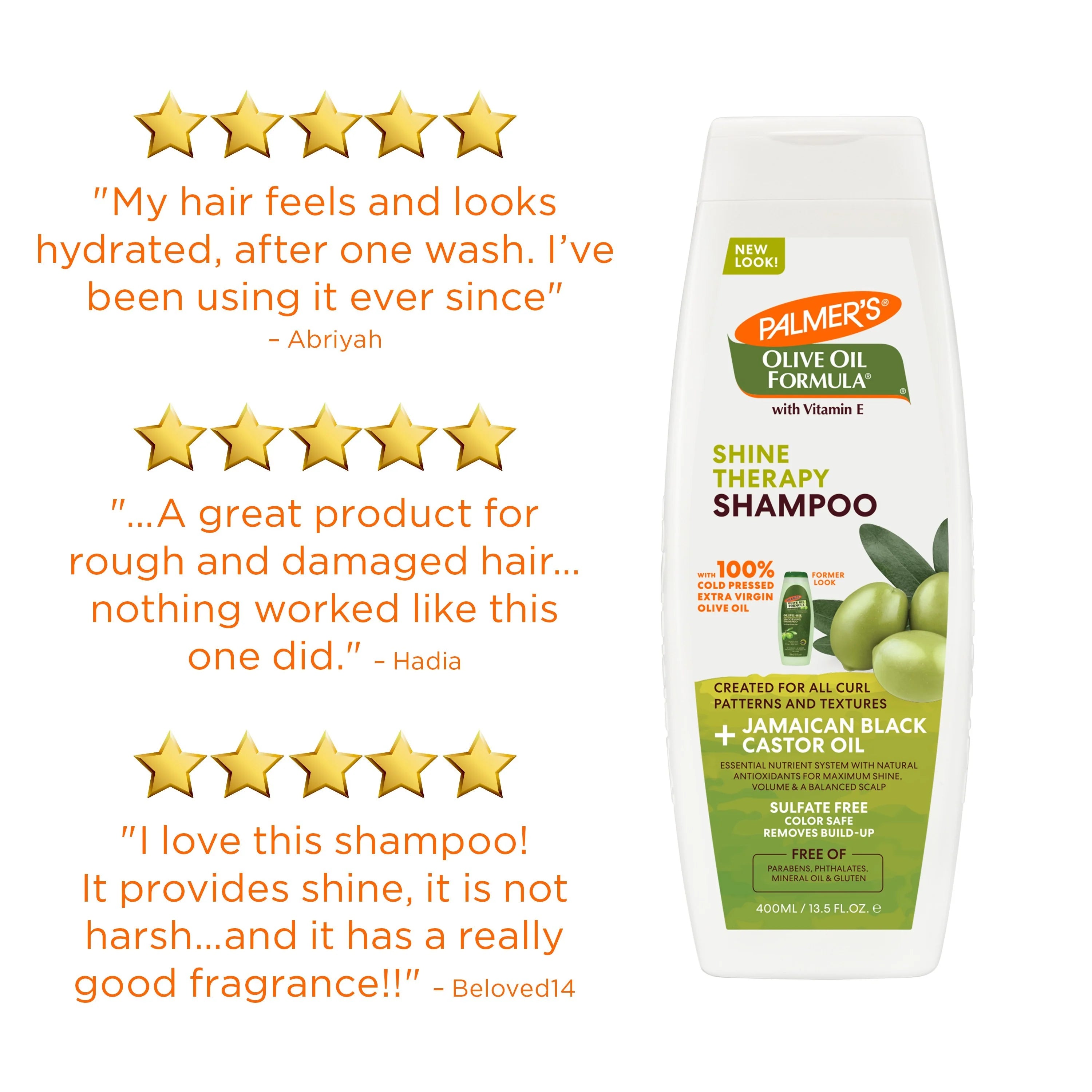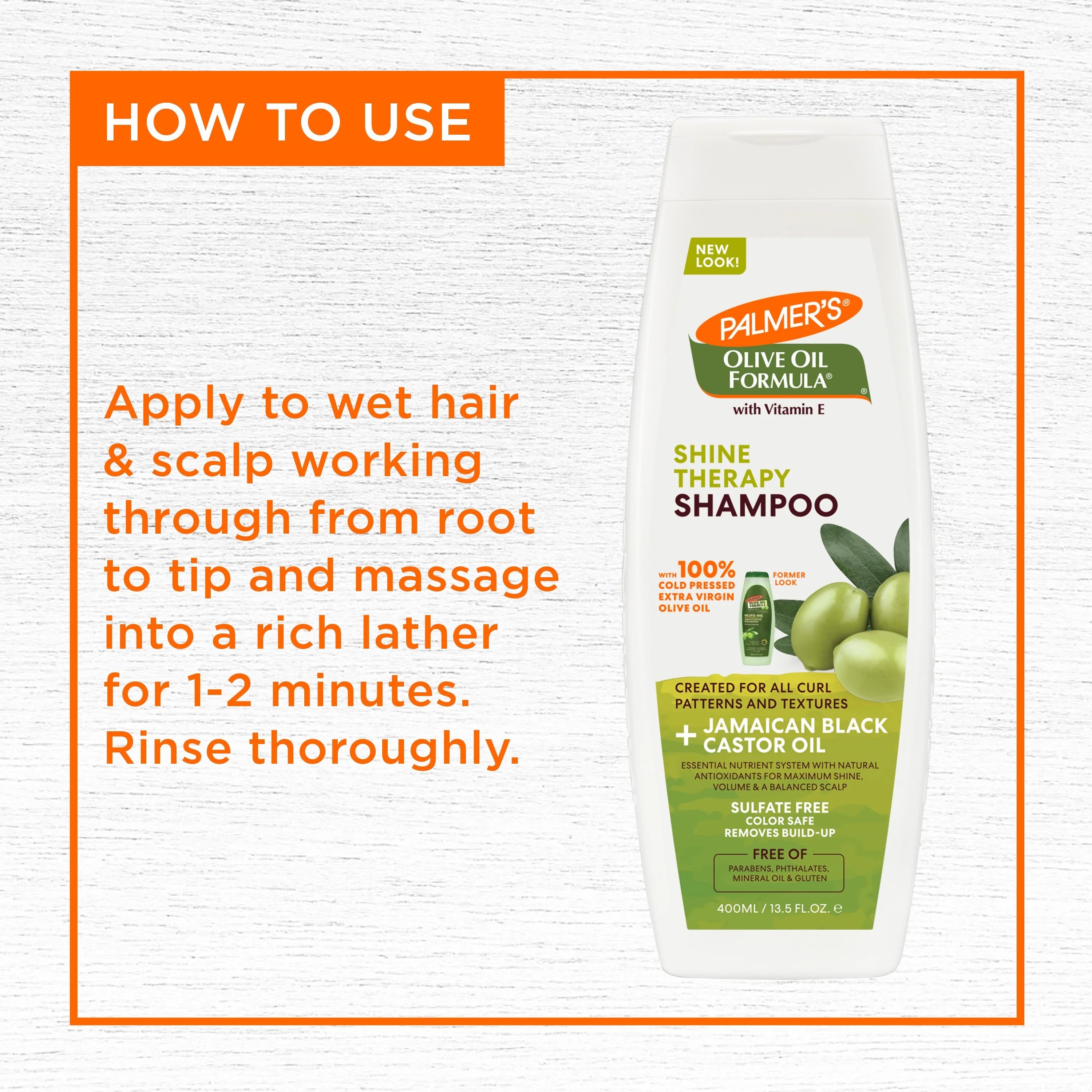 Palmer's Olive Oil Formula Shine Therapy collection perfectly nourishes dull, frizzy hair and dry scalp to maximize fullness and improve manageability, for irresistibly soft and shiny hair. This shine enhancing emollient packed with antioxidants soaks into the hair preserving hydration while smoothing strands and minimizing frizz creating softer, shinier more manageable hair. Olive Oil also invigorates the skin and soothes tightness to support a healthy scalp foundation. Helps rid the scalp of environmental toxins creating an optimal foundation for growing hair. Jamaican Black Castor Oil also locks in moisture and promotes fuller strands.